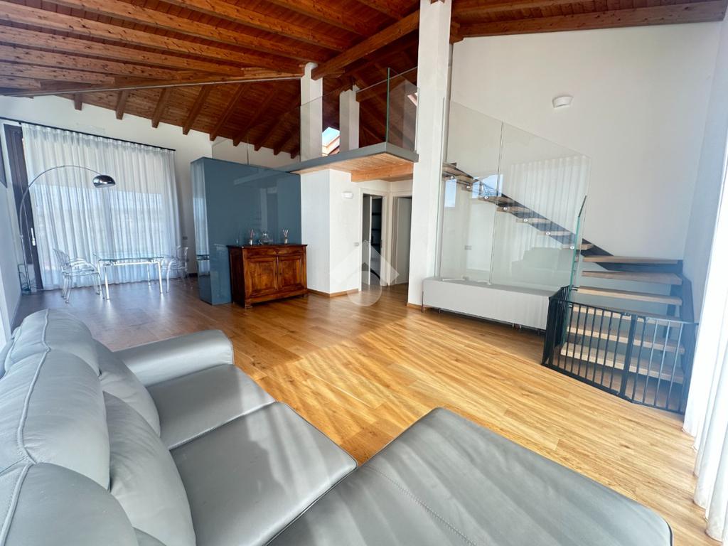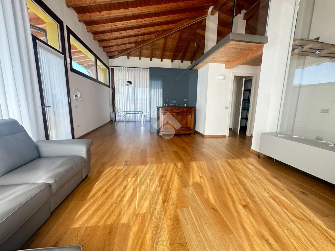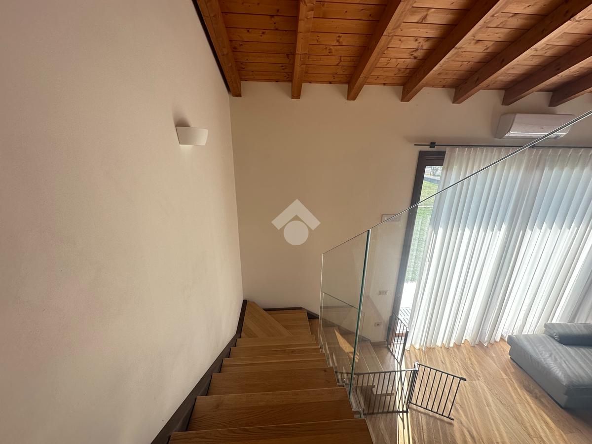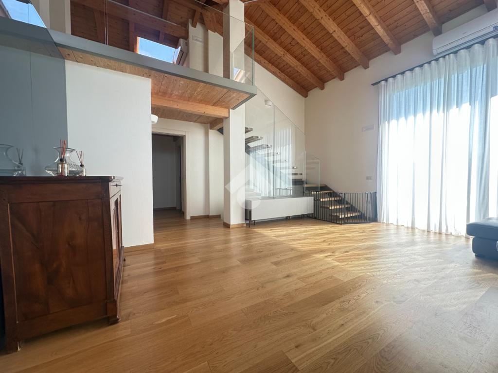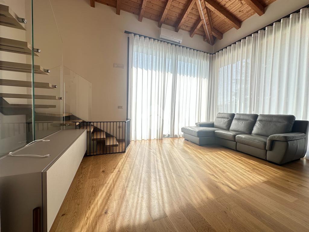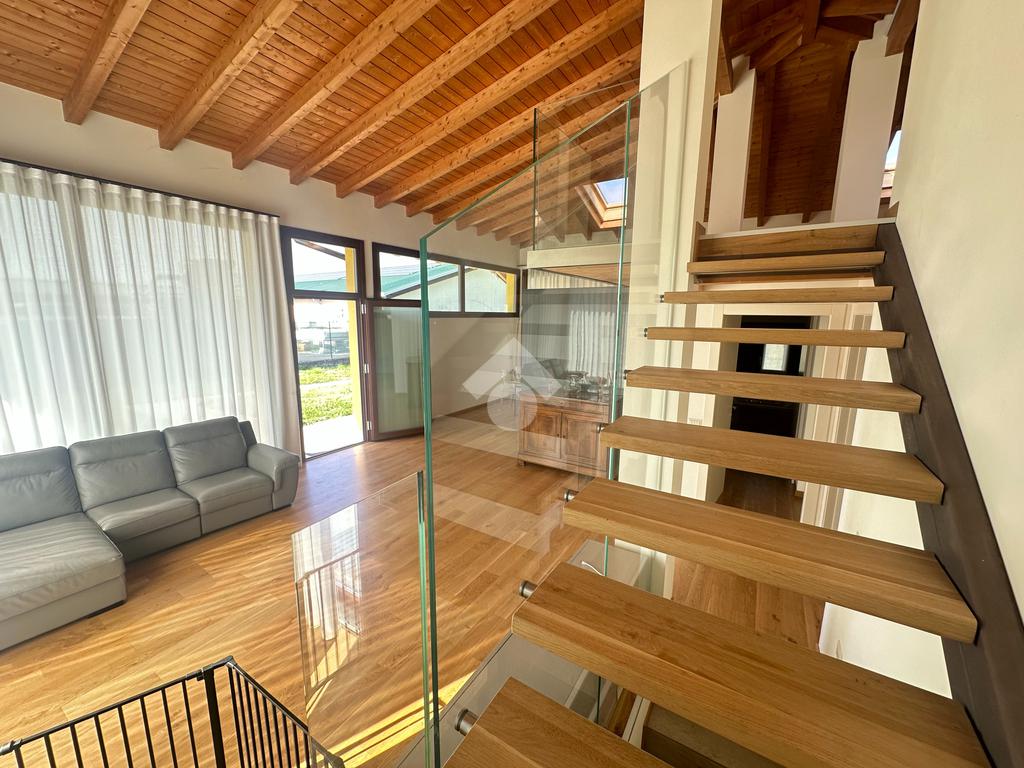 Internamente l'immobile è così suddiviso: ampio e luminoso salone, valorizzato da grandi vetrate scorrevoli che creano continuità tra interno ed esterno, cucina abitabile separata, camera matrimoniale padronale con bagno finestrato en suite (box doccia) e spaziosa cabina armadio, seconda camera matrimoniale, servizio finestrato padronale con vasca idromassaggio, ripostiglio e vano lavanderia. Il piano primo soppalcato, con affacci interni e illuminato da lucernari Velux, ospita un elegante open space ideale come terza camera, studio o area relax/accessoria.