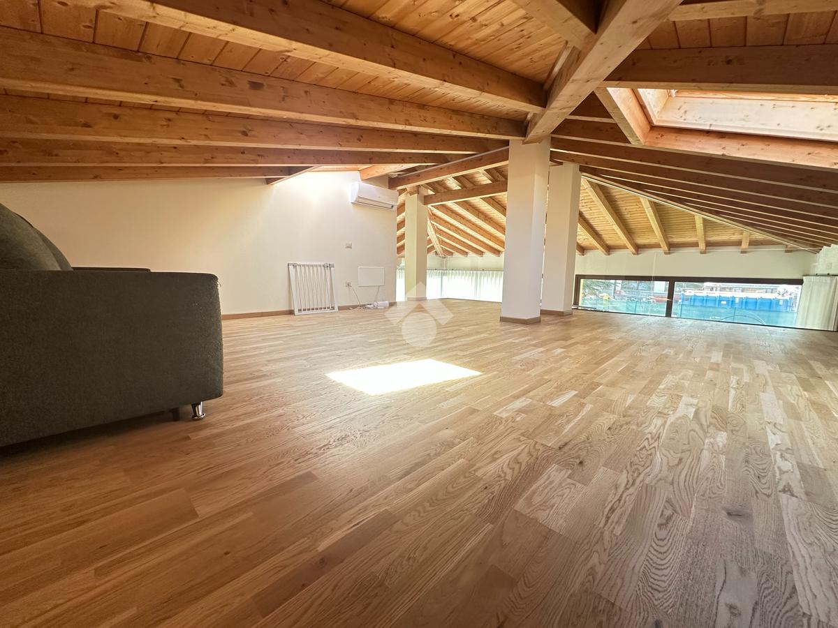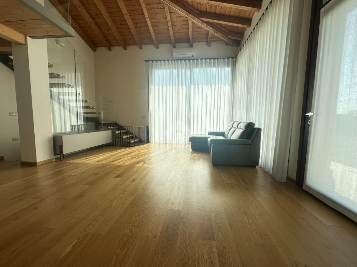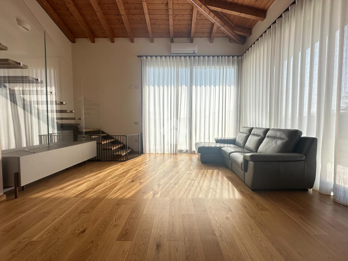 L’immobile si sviluppa su una superficie commerciale di 172 mq, distribuita su due livelli fuori terra, con eleganti travature a vista in legno che conferiscono calore e raffinatezza agli ambienti.